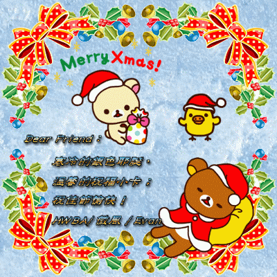 寒冷的,銀色耶誕; 溫馨的,動人旋律; 祝福像雪花,片片落下; 快樂像陽光,天天綻放; 願帶給你是愉悅的心! HWBA•微風•Wei-lun Chen•Evan 在此祝您聖誕快樂! |